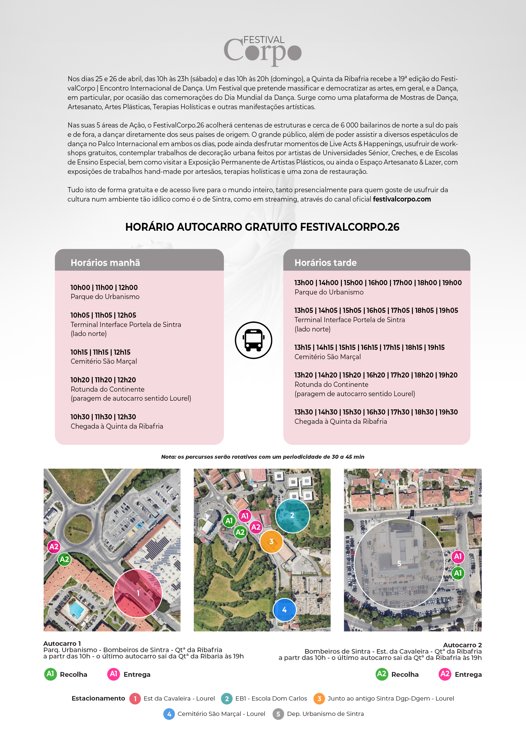Nota: Após chegada à Portela de Sintra, o FestivalCorpo.26 dispõe de autocarros gratuitos que fazem o transporte de público e bailarinos. Horários e locais de estacionamento alternativo abaixo.